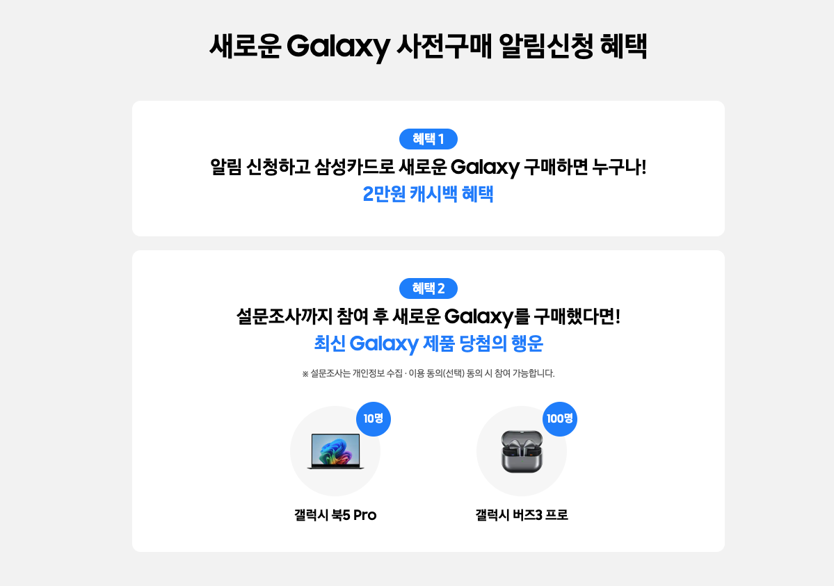 - 설문조사 참여 후 갤럭시S25 구매시 : 갤럭시 북 pro 5명, 갤럭시 버즈3 프로 100명 추천 제공