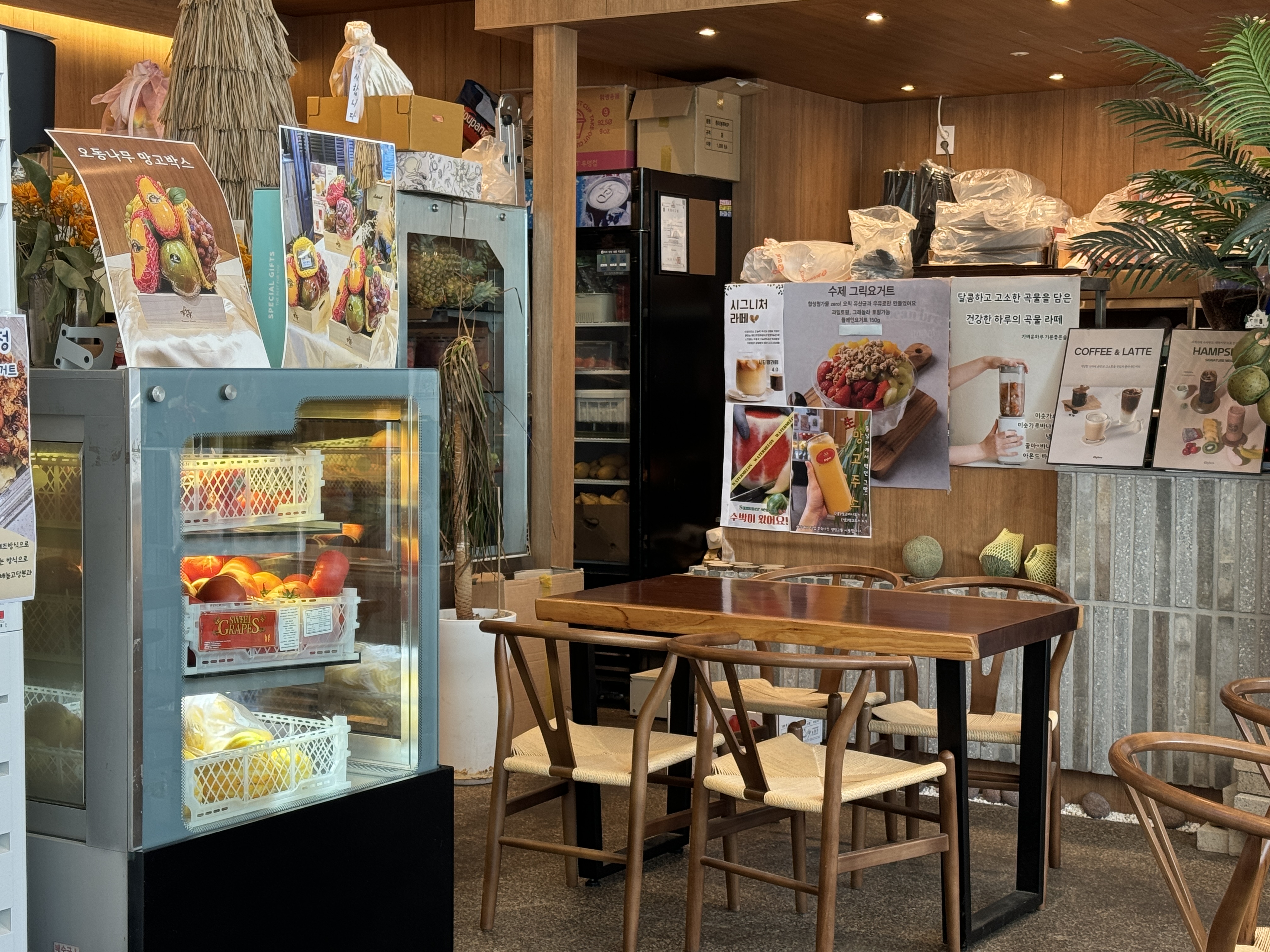 창가를 바라보는 Bar 테이블도 있고 중앙에는 넓은 원목 테이블 안쪽에는 야자수와 어우러지는 휴가 분위기 내부 인테리어까지 더해져서 샌드위치, 과일도시락, 샐러드, 디저트까지 다양한 메뉴들로 방문자들의 눈과 입을 즐겁게 해주는 곳이다