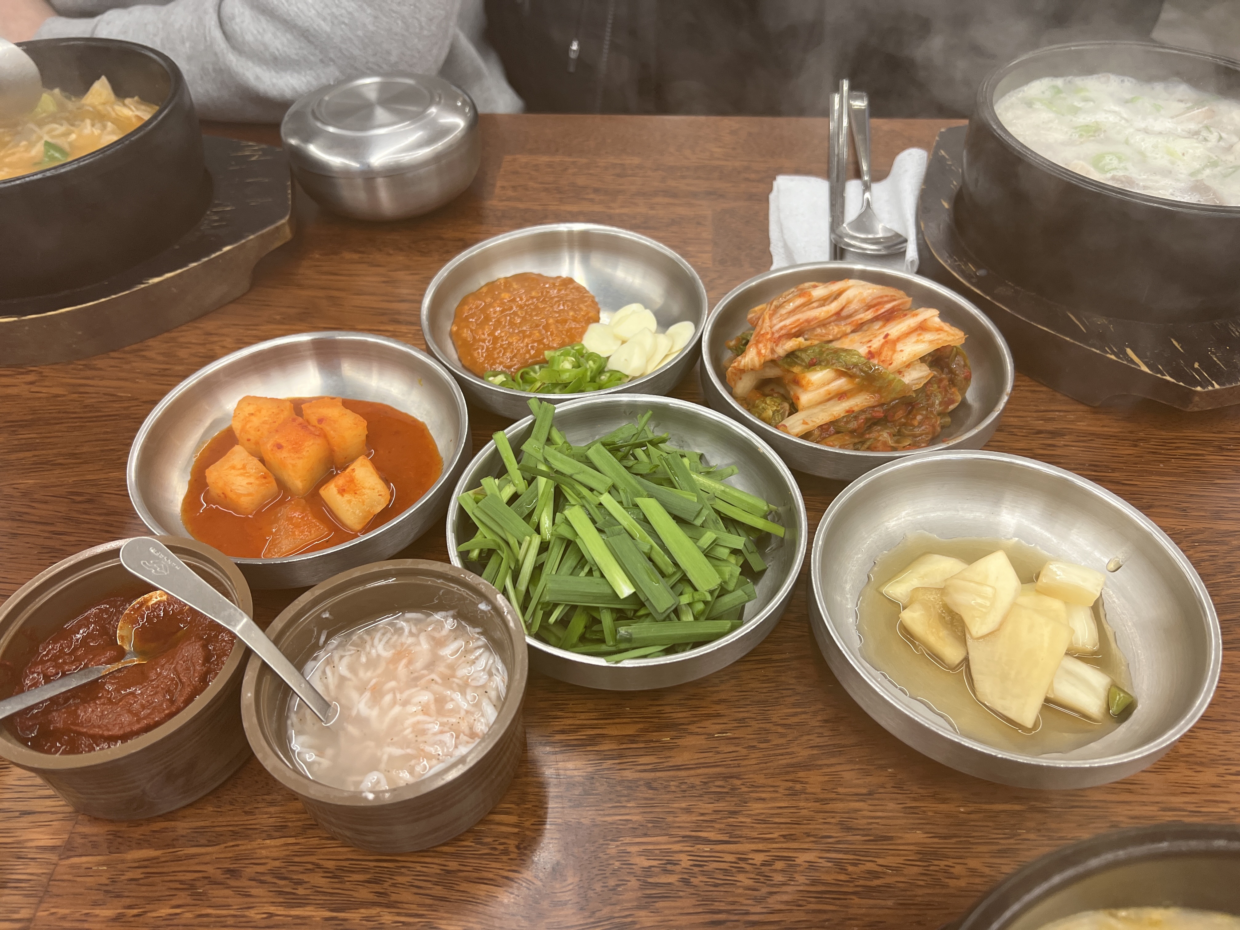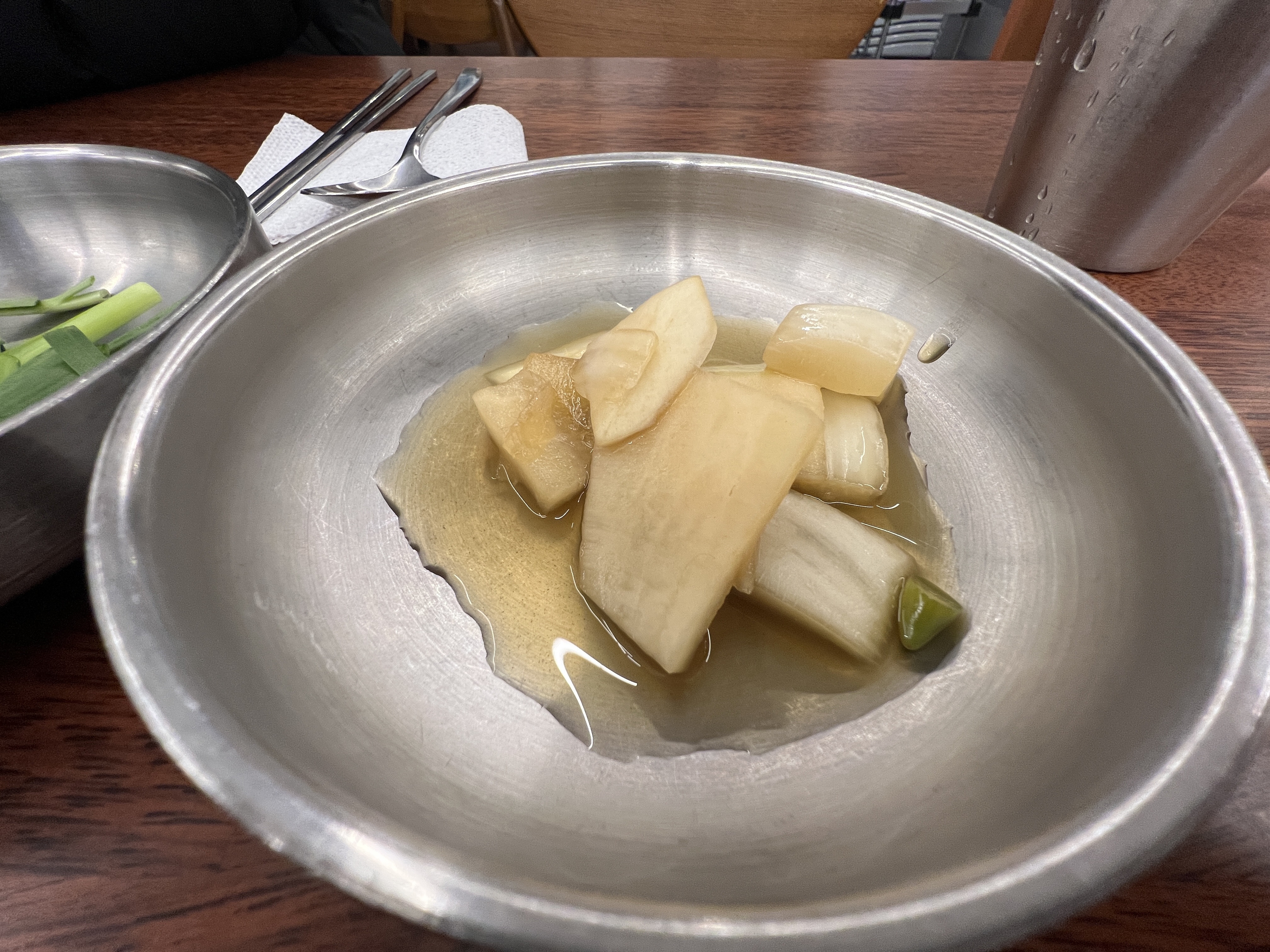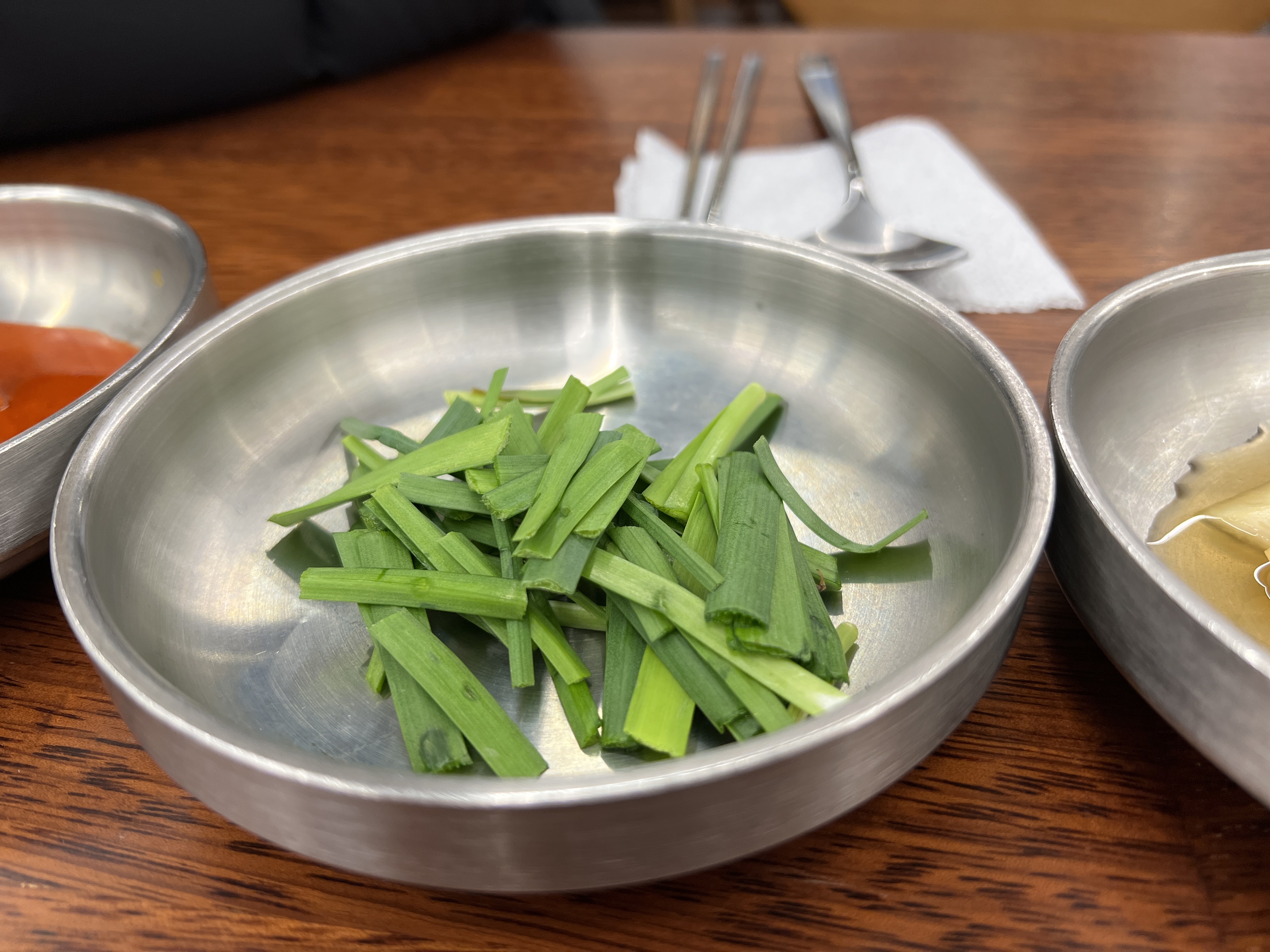 부추와 깍두기침기, 배추김치는 기본으로 세팅되어 있고 청양고추와 마늘은 셀프바에서 취향에 맞게 가져와서 먹으면 된다.