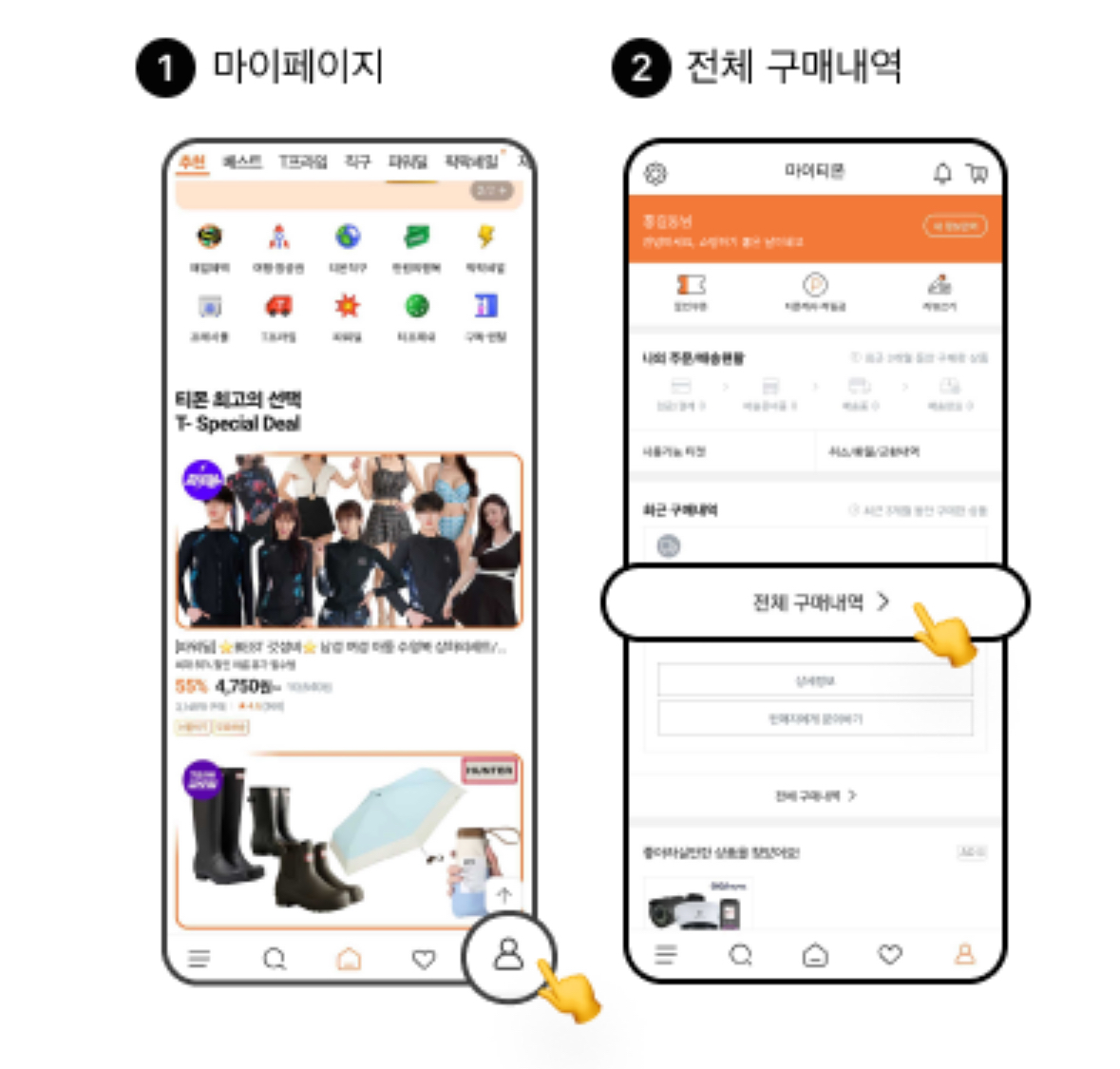 티몬 앱/웹에서 로그인 후 마이페이지에 들어간 후에 전체 구매내역을 찾아 들어갑니다.