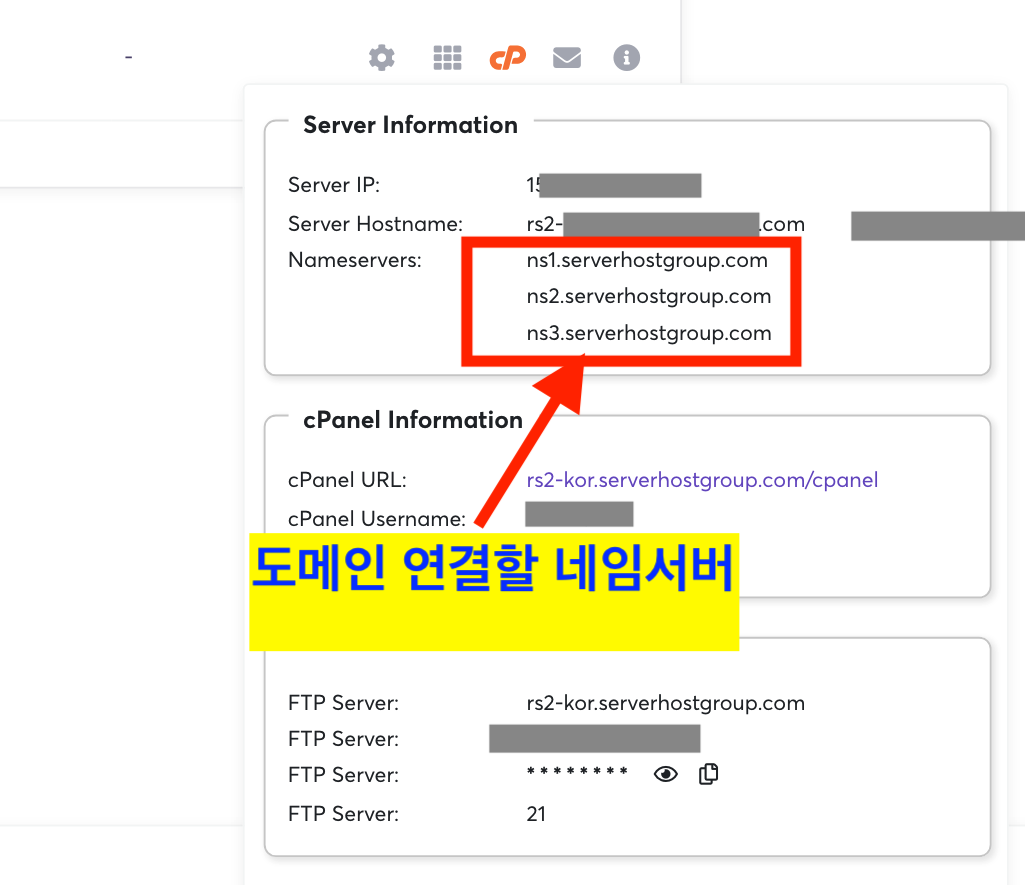 아래와 같이 클릭하면 나오는 서버 정보의 네임서버를 도메인 등록회사에서 변경해줍니다.