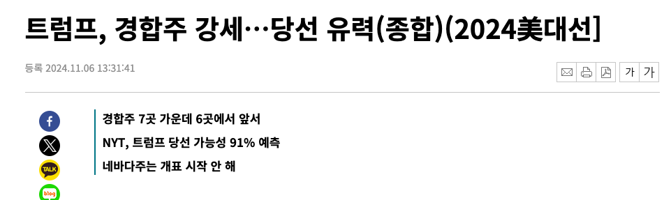 벌써, 국내 기사에서도 경합주 7곳 가운데서 6곳이 앞섰고 선거인당 16명이 걸려있는 노스캐롤라이나는 트럼프가 당선되었다고 속보로 나왔다.