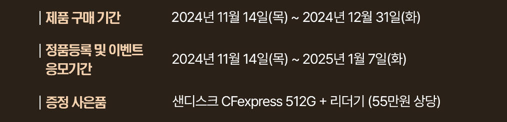 - 정품 등록 사은품 : 샌디스크 CFexpress 512ㅎ + 리더기 (55만원 상당)