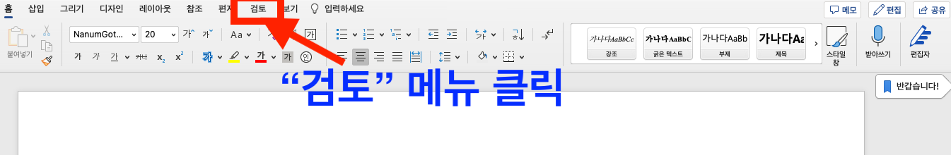 MS 워드에서 아래와 같이 상단에 있는 메뉴 중에서 "검토" 메뉴를 클릭합니다.